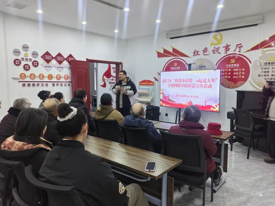 源汇区委网信办联合多家街道社区,开展“辟谣不打烊 e起过大年——防范金融谣言 守护财产安全”主题宣讲活动。活动聚焦网络平台常见的虚假“内幕消息”、高收益投资陷阱、虚假保险产品、非法集资套路等违法不良信息,通过真实案例深入剖析其欺骗本质与危害,并以通俗易懂的方式讲解辨识信息真伪、防范个人信息泄露、通过正规渠道举报等实用方法,切实增强辖区居民对经济金融领域网络谣言的“免疫力”,筑牢安全防范意识。