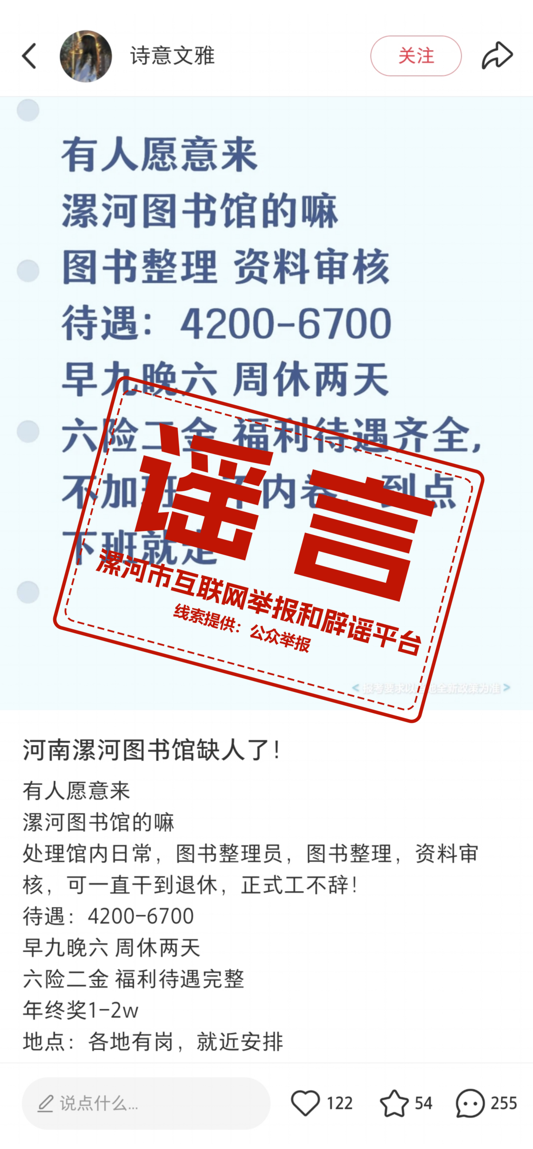 近日,小红书账号“诗意文雅”发布“漯河市图书馆招聘工作人员”的信息,声称“河南漯河图书馆缺人了!有人愿意来漯河图书馆的嘛?图书整理、资料审核,待遇4200-6700元,早九晚六,六险二金……”。